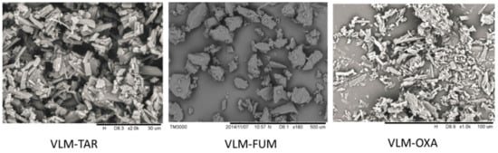 The multi-component solids of VLM were successfully prepared. The experiments were repeated three times, and its yields for VLM-TAR, VLM-FUM, VLM-OXA were 85%, 73%, and 78%, respectively. X-ray powder diffraction patterns for organic acids and VLM and its multi-component solids are shown in Figure 2. The XRPD data showed that all of VLM multi-component solids displayed crystal characterization. The thermal analysis of organic acid and VLM and its multi-component solids was carried out by DSC, and the results are shown in Figure 3. The calculated thermodynamic parameters are presented in Table 2. As depicted in Figure 3, amorphous VLM had no certain melting point and exhibited a small endothermic step at 50 °C, which corresponded to the glass transition temperature. Three crystalline multi-component solids exhibited an apparent melting point at 175 °C for VLM-TAR, 130 °C for VLM-FUM, and 125 °C for VLM-OXA, respectively. These data indicated that the multi-component solids had better thermal stability than VLM. To determine the similar polymorph of prepared samples, the XRPD and DSC were tested for samples obtained in the same method again, and the results are shown in Figures S1 and S2. Results indicated that no polymorph occurred, and all of them cocrystallized in the same polymorph. Figure 4 shows the crystal morphology of multi-component solids of VLM. Both of VLM-TAR and VLM-OXA were rod-like, while VLM-FUM was block-like.