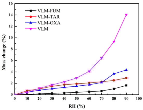 The DVS isotherms for VLM and its multi-component solids were determined at 25 °C. The results are summarized in Table S1 and graphically depicted in Figure 5. For all solid samples, the moisture contents in the measurement room increased with a rising of relative humidity from 0 to 90%. From the results, VLM was found to be the highest hygroscopic solid form compared with the other three multi-component solid forms. For RH = 90%, the amount of moisture adsorbed by VLM was 15%, which was higher than the other three solid forms. Obviously, the moisture content changed sharply vs. RH for VLM solid, while it changed slightly for the other three crystalline multi-component solids in the total range of RH. Furthermore, the morphology of solid samples after DVS experiments had also been checked, and the amorphous VLM would become a gel, while multi-component solids just kept original shape. The results confirmed again that the three novel multi-component solids had better physical stability than pure VLM.