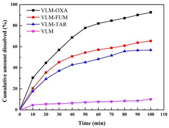 The intrinsic dissolution rate of VLM and its multi-component solid was measured by Electrolab under pH = 6.8 at 37 °C, and solution concentration was determined by the UV-vis spectrum. The UV-vis absorption coefficient (ξ) was determined to be 0.0276, 0.0165, 0.0397, and 0.0202 for VLM, VLM-TAR, VLM-FUM, and VLM-OXA, respectively. Results of solution concentration and cumulative amount dissolved are depicted in Table S2 and graphically shown in Figure 6. The amount of drug dissolved in the first 10 min (Q10 /%) and the time required for the dissolution of 50% drug (T50% /min) are depicted in Table 4. The dissolution profile of VLM indicated a slow dissolution rate, with only 4.56% of the drug being dissolved in the first 10 min, and it might need infinite time to dissolve 50% of the added drug. The total amount of VLM dissolved in 100 min was just over 10% of the initial amount added. So, multi-component solids of VLM dissolved faster than VLM itself. The amounts of the drug dissolved in the first 10 min were 17.69%, 20.54%, and 30.54% for VLM-TAR, VLM-FUM, and VLM-OXA, respectively. The time required for dissolving 50% of the added drugs was 60 min, 40 min, and 25 min for VLM-TAR, VLM-FUM, and VLM-OXA, respectively. In addition, the total amounts of drugs dissolved in 100 min were 56.81%, 65.45%, and 92.63% for VLM-TAR, VLM-FUM, and VLM-OXA, respectively (Figure 6 and Table S2). From the similarity factors, which are shown in Table 5, the pure VLM was different from all the tested multi-component solid forms of VLM (f2 was in the range of 10%–21%). With respect to the recorded dissolution profiles in the case of three multi-component solid forms of VLM, the similarity factor test revealed similar dissolution profiles for the VLM-TAR, VLM-FUM, and VLM-OXA (f2 was in the range from 50% to 80%). However, it is important to note that the recorded Q10 value for VLM-OXA was higher than other multi-component solid forms of VLM. This could be explained by the fact that the chosen oxalic acid had a higher solubility than fumaric acid and tartaric acid. The above results demonstrated that the solubility and dissolution rate of APIs could be significantly increased by the formation of multi-component solid forms of API with other acids.
