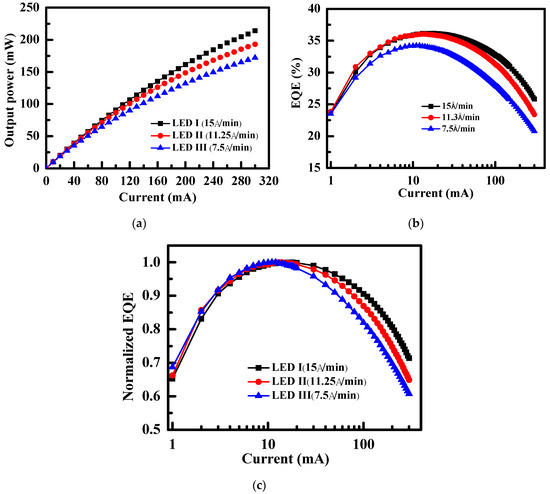 The LOPs, external quantum efficiency (EQE), and normalized EQE of the fabricated LEDs on a linear and log I scale as shown in Figure 1a–c, respectively. As shown in Figure 1a, the LOPs of LED I, LED II, and LED III were 106.6, 100.7, and 90.0 mW at 120 mA, respectively. In addition, the LOP of LED I at 120 mA was enhanced by 5.9% and 18.4% compared with LED II and LED III, respectively. It was evident that LED I exhibited a superior LOP. Otherwise, the LOPs of LED I, LED II, and LED III were 214.2, 192.9, and 172.0 mW at 300 mA, respectively. As compared with LED II and LED III, the LOP of LED I was improved by approximately 11.0% and 24.5% at 300 mA, respectively. The same tendency is also shown in Figure 1b. The differences of LOP and EQE between the fabricated LEDs evidently became significantly larger especially, at higher injection currents. Then, as shown in Figure 1c, normalized EQE can more clearly compare the differences of the efficiency droop. It was found that the EQE decay percentages from maximum EQE to EQE at 300 mA of LED I, LED II, and LED III were 28.6%, 35.1%, and 39.3%, respectively. Such a result once again pointed out that the optical properties of LED I were superior to those of the others whether operating at low or high injection currents. The physical mechanism of this phenomenon will be proposed in the following paragraphs in detail.