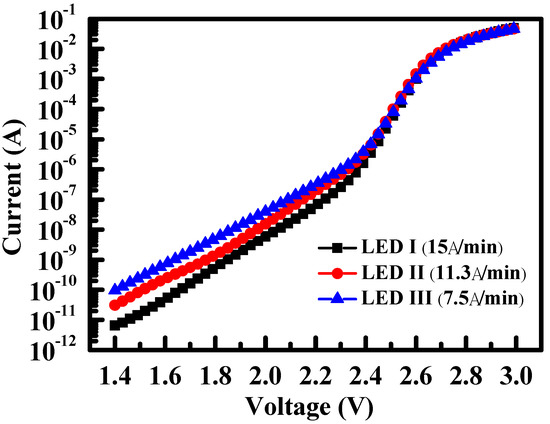 Figure 2 shows the forward current–voltage characteristics on a semilogarithmic scale. It is obvious that the forward current of LED III under the forward bias voltage of 2.4 V is larger than that of the other LEDs. According to the equivalent circuit model of the pn junction diode [18], LED III— with a smaller parallel resistance—is attributed to a larger leakage current. It is pointed out that the excess current of LEDs generated at a voltage of less than 2.4 V is attributed to the minority carrier recombination by the traps in the depletion region most likely related to the V-defects in the MQWs, which arise from the heterointerfaces between the wells and barriers [19,20]. Figure 3a,b shows the (002) and (102) double-crystal X-ray diffraction (DCXRD) spectra of LED I and LED III, respectively. It can be seen clearly that both the main and satellite peaks of (002) XRD spectrum of LED I exhibit larger intensity and narrower full-width at half-maximum (FWHM) than those of LED III in Figure 3a. The same results are also shown in (102) XRD spectrum. The superior X-ray (102) characteristic of LED I implies a lower V-pits density forms along the threading dislocations. Such a result demonstrates that the crystal quality of MQWs of LED I with a higher barrier growth rate is better than that of LED III, which corresponds to the forward I–V characteristics, as mentioned above.