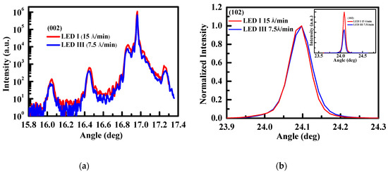 The (a) (002) and (b) (102) DCXRD spectra for LED I and LED III.