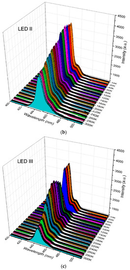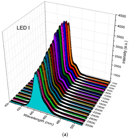 Figure 5a–c show the temperature-dependent electroluminescence (EL) spectra of LED I, LED II, and LED III, respectively, cooled from 300 K down to 10 K at 5 mA by Helium compressor system and the temperature was controlled by the temperature sensor and heat controller. The similar tendency of temperature-dependent EL intensity of these three fabricated LEDs was observed. As the temperature went down from 300 K, the light intensity of the emission for the LEDs increased. This is attributed to the reduction of the non-radiative recombination rate in the MQW. In other words, the carrier capture rate by the defects will decrease as the temperature decreases [25]. Therefore, the internal quantum efficiency (IQE) of the fabricated LEDs will be increased. Then, the light intensity of the emission began to drop as the temperature kept decreasing due to the reduction of electron and hole concentrations [26]. On the other hand, it was found that the light intensity and FWHM of the emission spectrum for LED III were smaller and wider than those of the other two. In addition to this, it can also be observed that LED III displayed a more evident emission sub-peak than those of the other two around the wavelength of 460 nm. Furthermore, as the ambient temperature decreases, the intensity of the sub-peak has a more significant proportion in the emission spectrum in Figure 5c. This is because when the ambient temperature is lower, the injected carriers into the MQWs are more easily attracted and confined in the localized states with lower potential energy and the longer light wavelengths are emitting. It is suggested that the localized states in the InGaN/GaN quantum wells are created by random indium alloy fluctuations or indium-rich clusters [23,24], which could be attributed that the growth temperature of the quantum barriers was 110 °C higher than that of the quantum wells. As described in the previous paragraph, the higher growth temperature of the quantum barriers can induce indium fluctuation in the MQWs. In addition, the LEDs with quantum barriers grown with a lower growth rate have a larger strain and piezoelectric polarization field between GaN and InGaN due to the strong lattice mismatch. This is the reason that the lattice constant of the GaN quantum barrier of LED III with a lower growth rate will be closer to the ideal value of GaN bulk than that of LED I, which would result in a larger lattice mismatch between the GaN barrier and InGaN well. Therefore, as the carriers are injected into the MQWs, the localized states with the potential minimum in the QWs created by random indium alloy fluctuations or indium-rich clusters leads to a higher partial carrier density in the QWs, which has a significant effect on the FWHM of the spectrum of emitted light. The Auger recombination procedure in the MQWs is extremely enhanced by the carrier localization mechanism [27]. According to the recombination rate equation of the LEDs (i.e., R = An + Bn2 + Cn3), the Auger recombination (Cn3) is a dominant recombination mechanism at higher current injection density. Thus, the efficiency droop effect induced by Auger recombination will become more serious especially, at higher injection current levels. Therefore, LED III has a more serious carrier localization effect induced by random indium alloy fluctuations. Such a result demonstrates why LED I exhibits the weakest efficiency droop effect in Figure 1b.