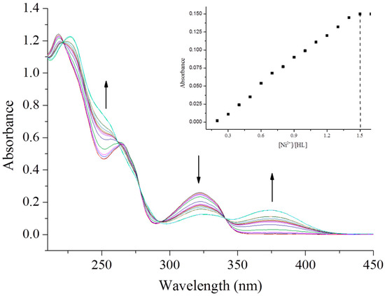 The UV-Vis titration of the Ni(II) complex is depicted in Figure 1. During the UV-Vis titration, we can easily observe that the HL shows three typical absorption peaks at 218, 265, and 322 nm, which can be assigned to the π–π* transition [66]. With the increase of concentration of Ni(II) ions, the three typical peaks of HL changed, the peaks at 265 and 322 nm disappeared. Meanwhile, a new peak appeared at 375 nm, and attributed to HL to metal LMCT [67,68,69], which is characteristic of the transition metal salen-type complexes. In addition, when the ratio of HL to metal ions is lower than 2:3, the absorption intensity increases linearly with the concentration of Ni(II) ions, and when it reaches 3:2, the absorption spectrum no longer changes with the increase of concentration of Ni(II) ions, indicating that the titration reaches the end point. In the UV-Vis titration, we formulated the ligand HL to a concentration of 5.0 × 10−5 M, and the Ni(OAc)2·4H2O was formulated to a concentration of 1.0 × 10−3 M.