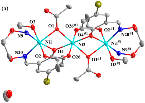 (a) Molecular structure of the Ni(II) complex with 30% probability displacement ellipsoids (hydrogen atoms are omitted for clarity); (b) coordination polyhedrons for Ni(II) atoms.