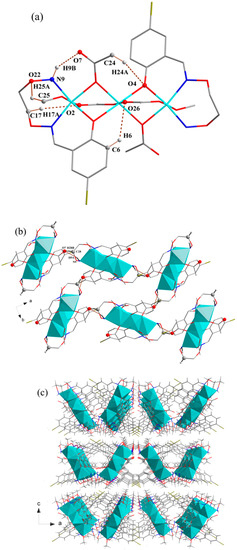 As illustrated in Figure 3a, there are five pairs of different intra-molecular hydrogen bond interactions [70,71], which are N9–H9B⋯O7, C6–H6⋯O26, C17–H17A⋯O2, C24–H24A⋯O4, and C25–H25A⋯O22 intra-molecular interactions, and inter-molecular hydrogen bonding interactions (N9–H9A⋯O7 and C28–H28B⋯O7) shown in Figure 3b, except for the hydrogen bonding formed, other hydrogen atoms were omitted. Hydrogen bonding interactions of the Ni(II) complex are summed in Table 4. The hydrogen bond interactions play a major role in the building of the Ni(II) complex. Through this inter-molecular hydrogen bonding inter-action, each molecule of the Ni(II) complex is connected to each other to gain a two-dimensional supra-molecular network along the ab plane. At the same time, in Figure 3c, through the inter-molecular hydrogen bonding interactions, this network structure is connected to each other to gain an infinite three-dimensional supra-molecular structure.