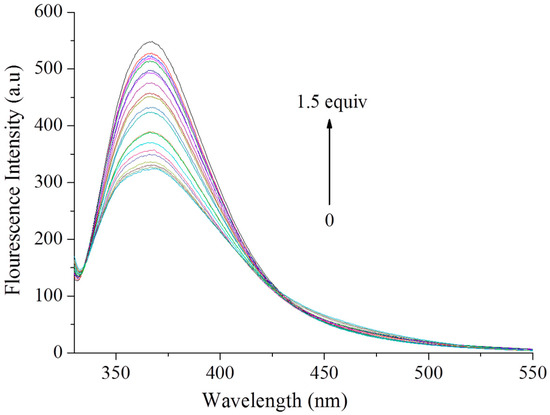 When the excitation wavelength is 315 nm, the ligand HL exhibits a strong absorption peak at 365 nm, which is attributed to the π–π* transition. During the fluorescence titration experiment, the fluorescence intensity decreases as the concentration of the metal(II) ions increases. The decrease in fluorescence intensity was mainly owing to the bonding of the (L)− ligand with the Ni(II) ions. Compared with the emission spectrum of HL, the decrease in the fluorescence intensity of the complex was obtained, showing that the fluorescence was quenched due to the introduction of the Ni(II) atoms.