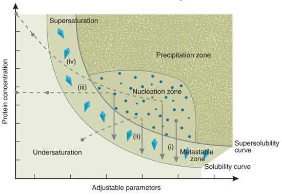 - Saridakis, E.; Chayen, N.E. Systematic improvement of protein crystals by determining the supersolubility curves of phase diagrams. Biophys. J. 2003, 84, 1218–1222. [Google Scholar] [CrossRef]