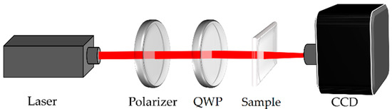 To characterize the diffractive performance of the PB lens, an experimental optical setup for generating and analyzing focused/defocused beams was built, as illustrated in Figure 3. As shown in Figure 3, a 671 nm laser beam passes through a polarizer and then a quarter wave-plate (QWP), and then illuminates on the sample and finally is captured by a Charge Coupled Device (CCD). The angle between the polarization direction and the c-axis of the QWP was set to be +45°/−45° to control the incident RCP/LCP polarization, respectively. The transformed output focused/defocused beams are thus generated.