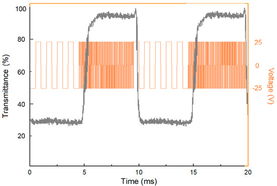 Therefore, while keeping these voltages, the switching between On/Off states could be realized by merely alternating the frequency. As a key parameter of a diffractive element, the switching time is measured. Since a larger voltage quickens the response [20], the switching performance of the PB lens sample is measured by applying an external electric field of 25 V. Furthermore, the major challenge of DFLC devices is the noticeable dielectric-heating effect originating from the applied high frequency, which in turn causes the fc to drift [21,22]. The fc satisfies the Arrhenius equation, and is proportional to exp(−E/kBT), where kB is the Boltzmann’s constant, and T is the absolute temperature. The fc increases with the increasing of T [23]. In our experiments, the measured fc was 40 kHz. DFLC dielectric constant Δε was 4.2 at 1 kHz, while it shifted to −3.1 at 65 kHz. When the frequency was over 100 kHz, Δε maintained a constant value of −3.5. A higher frequency will induce a more serious thermodielectric effect, which leads to an instability of crossover frequency. To minimize the thermodielctric effect, the frequency was set at 65 kHz. In order to get a precise measurement, we added a tunable aperture (the diameter set at 0.40 millimeters) before the optical power detector, and adjusted it to an appropriate position to ensure that the focused beam could completely pass through it, while only a very small amount of the unfocused beam passes. As illustrated in Figure 5, a 25 V alternating voltage was applied with frequency interconverting of 1 kHz and 65 kHz, and lasting for 5 ms each signal cycle. The switching times between focused/unfocused states (defined as the duration time that intensity changes from 10% maximum to 90% maximum and reverse) were measured as 680 μs and 550 μs, respectively. Thus, submillisecond switching processes were achieved.