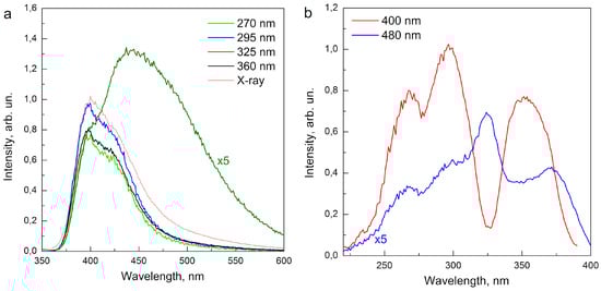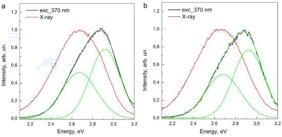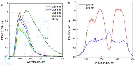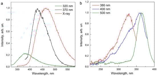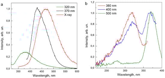 In Figure 4a,b photoluminescence, excitation and X-ray luminescence spectra of Y2SiO5:Ce3+ nanocrystals are shown. These spectra are similar to the spectra of Lu2SiO5:Ce3+ nanocrystals.