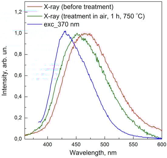 Luminescence spectra of Y2SiO5:Ce3+ (1 at. %) nanocrystals at different excitation before and after additional high-temperature treatment in air atmosphere (1 h, 750 °C).