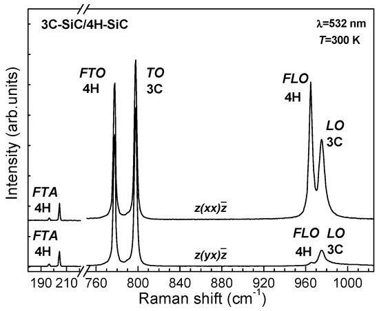 To confirm the polytype of the epitaxial layer in 3C-SiC/4H-SiC heterostructure, Raman spectroscopy was used. Polarized spectra were measured at room temperature under the 532 nm laser light excitation in the and scattering configurations. Here z and are perpendicular to the (0001) plane of the substrate, while x and y are mutually orthogonal and lie in the plane perpendicularly to the z direction.