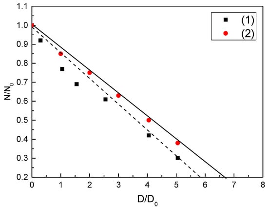 Normalized dependences of the electron concentration on irradiation dose: (1) 3C-SiC/6H-SiC structures, D0 = 1 × 1012 cm−2, N0 = 8 × 1014 cm−3, (2) 4H-SiC epitaxial layers, D0 = 1 × 1015 cm−2, N0 = 6.5 × 1017 cm−3.