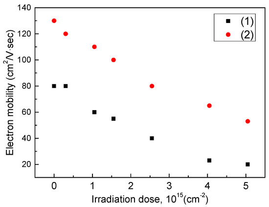 The results obtained in a study of the electron mobility are presented in Figure 3. It can be seen in the figure that the electron mobility nearly linearly decreases with increasing irradiation dose. Apparently, this is due to the rise in the concentration of charged radiation defects, which are additional carrier-scattering centers. Interestingly, the mobility at room temperature twice decreases after the maximum dose.