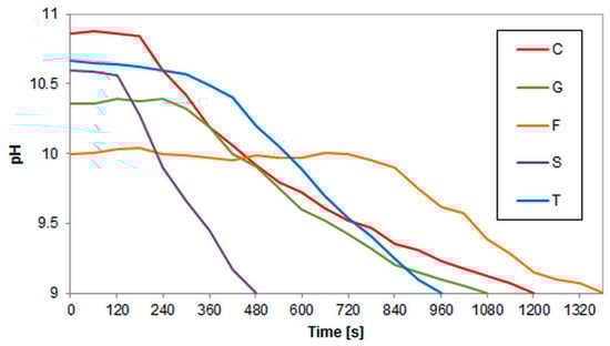 Evolution of the pH in the reaction mixture without additives (C), with addition of glucose (G), fructose (F), sucrose (S), and trehalose (T).