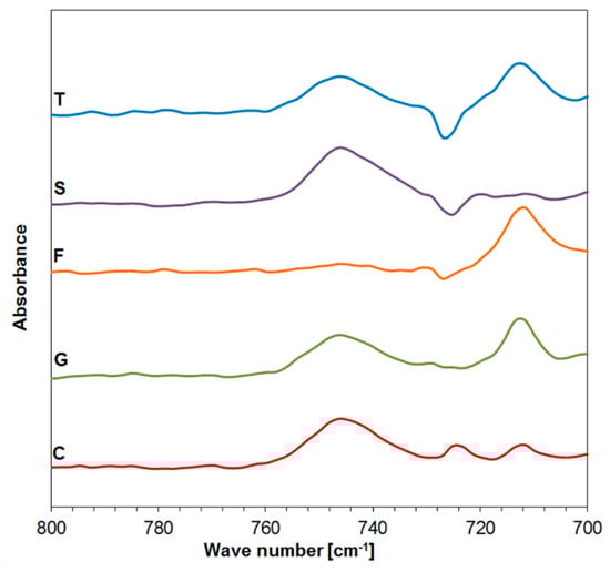 FTIR spectra of calcium carbonate particles precipitated without additives (C), with glucose (G), fructose (F), sucrose (S) and trehalose (T).