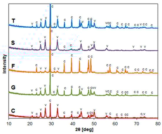 Both calcite and vaterite are detected in all samples by XRD analysis. The percentage content of vaterite in calcite-vaterite mixtures can be calculated using the equation []:
