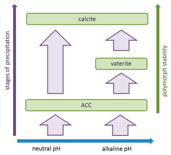 The precipitation mechanisms of calcium carbonate via vaterite to calcite particles have been widely discussed. When pH of solution is high the mechanism proposed by Rodriguez-Blanco et al. [,] distinguishes two stages of calcium carbonate crystallization. At the first stage amorphous calcium carbonate (ACC) is formed and then its transformation to vaterite takes place due to the rapid ACC dehydration. Formation of individual vaterite particles is preceded by the ACC internal structural reorganization. In the second stage, vaterite transforms into calcite via the slow dissolution. Because solubility product for calcite is lower than for vaterite, after crystallization of vaterite particles, the solution remains supersaturated with respect to calcite. Thus, vaterite dissolves releasing calcium and carbonate ions into solution, which then crystalize forming calcite particles. However, when CaCO3 precipitation process is carried out at a neutral pH, ACC nanoparticles tend to transform directly to calcite. The diagram of precipitation stages carried out at a neutral and alkaline pH is shown in Figure 4.