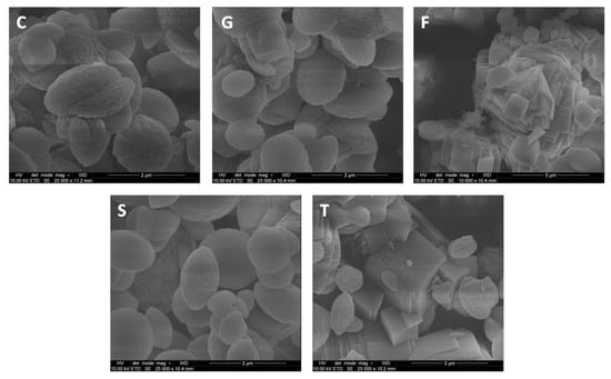 SEM images of calcium carbonate particles precipitated without additives C and with saccharides: G—glucose, F—fructose, S—sucrose, T—trehalose.