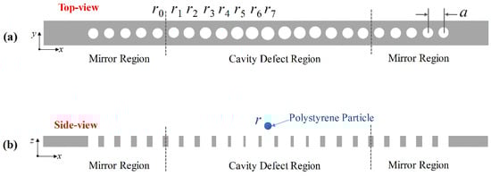 (a) Top-view and (b) Side-view of the structure of the larger-center-hole nanobeam photonic crystal cavity, above which a polystyrene particle is introduced. The position of the polystyrene particle deviates from the center of the largest hole of the cavity in the x direction is denoted as Δx. The distance between the center of the polystyrene particle and the top surface of the nanobeam cavity in the z direction is denoted as Δz.