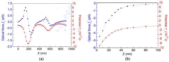 It should be noted that the potential is affected by the presence of the particle, since the refractive index of the polystyrene particle is larger than that of water. Thus, the optical force and potential were calculated with the particle located above the cavity. In the simulation, the light is input from one port of the nanobeam waveguide. Its frequency is set as the optical resonant frequency of the optical cavity with the particle located 5 nm above the cavity for the x direction (Δx is changed with Δz = 5). The calculated results are presented in Figure 4a. The calculation of optical force and potential on the particle in the z direction, in which the particle is located at a fixed Δx = 190 nm and a varied Δz, is shown in Figure 4b. Here, the negative and positive optical force refer to the direction of the force on the particle. For example, in the x direction, the negative or positive optical force refers to the force direction opposite or along the x axis, respectively. For the z direction, the negative optical forces indicate that the direction of the force is opposite the z axis, so that the particle will be trapped just above the cavity.