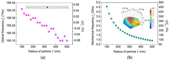 On the other hand, the mechanical frequency of the particle decreases from 4.6 GHz to 0.9 GHz with the increasing size of the particles from 100 nm to 500 nm in radius. Here, the mechanical mode of the particle is the lowest order mechanical mode with the symmetric strain in the x, y, and z axes, which can be detected by the optomechanical coupling between the cavity and the particle due to the self-induced back-action optical trapping. The corresponding changing percent of the mechanical frequency of the cavity, Δf/fm, achieves approximately 400%. This is because the particle size significantly affects its mechanical frequency. Here, the strain for the vibrated particle with a radius of 200 nm is also given in the inset of Figure 5b. Therefore, compared with the optical frequency shift of ±0.06%, the mechanical frequency shift shows a better performance for particle sensing, which can be used to distinguish or analyze different particles with great potential.