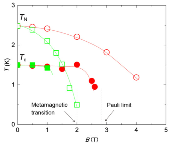 - Clogston, A.M. Upper limit for the critical field in hard superconductors. Phys. Rev. Lett. 1962, 9, 266–267. [Google Scholar] [CrossRef]