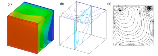 Iso-surfaces of the temperature field (a) and concentration field (b), streamlines on the mid-y-z plane (c) at the simulation condition that ReT = 200, Le = 10.