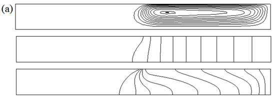 For the mixture investigated in this paper, the capillary ratio is −0.2, the negative sign describes the fact that the thermocapillary force is always opposite to the solutal-capillary force and the value of 0.2 indicate that the thermal-capillary effect is much larger than the solutal-capillary effect. Without rotation, the basic flow is dominated by the thermocapillary force. Figure 3 shows the streamlines, isotherms and iso-concentration lines of the basic flow at the meridian plane. When the ReT is less than a threshold value, the thermocapillary force drives the surface fluid flows from the hot crucible’s sidewall to the crystal/fluid interface, then a return flow appears in the liquid bulk, generating a counterclockwise convection roll cell. This flow structure is similar with that of the pure liquid in a Cz model [31,32]. For the temperature profile, the isotherms are almost parallel to the sidewall, except the isotherm near the crystal. Compared with the isotherms, the iso-concentration lines are more distorted and more sensitive to the flow, as shown in Figure 3a. This is because the Lewis number of the mixture is much larger than unit, hence the thermal diffusion is much faster than mass diffusion, creating greater deformation of iso-concentration lines. With the increase of ReT, the flow is enhanced, the maximum value of the stream function is increased to 0.37, the isotherms change very little, while the iso-concentration lines near the crystal and the sidewall become denser, indicating larger concentration gradients, as shown in Figure 3b.
