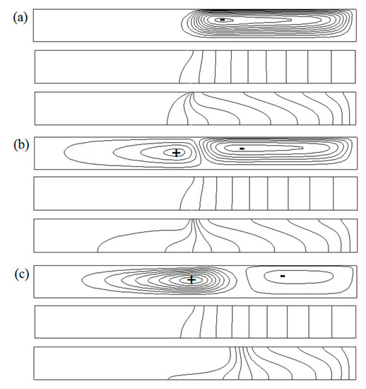 Characteristics of the basic flow when ReT = 400, including the Stream lines (upper), isotherms (middle) and iso-concentration lines (bottom) in the meridional plane. (a) Res = 94, Ψmax(−) = 0.17; (b) Res = 234, Ψmax(−) = 0.16, Ψmax(+) = 0.10; (c) Res = 702, Ψmax(−) = 0.15, Ψmax(+) = 0.87.