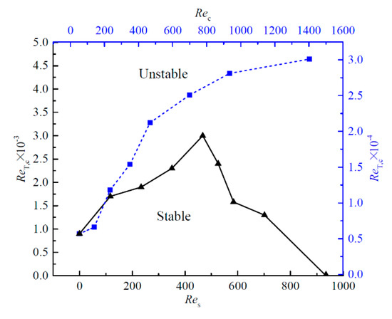 Figure 6 shows the critical conditions for the flow transition when the crystal or crucible rotates. It is found that without rotation, the critical conditions for the flow transition from basic thermo-soultal capillary flow to the 3D oscillatory flow is about 900, which is smaller than that of the pure fluid [31,32]. When the crucible starts rotating, the value of ReT,c increases monotonically, indicating that the rotation of crucible has an inhibitory effect on the thermo-soultal capillary flow instability. Meanwhile, as the increase of crystal rotation rate, the centrifugal force generated by rotation is opposite to that of the thermocapillary force, which suppresses the radial inward flow and depresses the flow instability, thus, the ReT,c increases with the increasing Res. However, with the further increase of crystal rotation, the cells generated by rotation is shearing with the circulation produced by thermo-soultal capillary flow, the disturbance is enhanced, thus, the critical value of ReT,c is decreased. It should be noted that when Res is increased to 950, the rotation driven flow is dominated, no stable state is observed.
