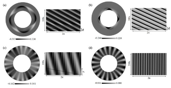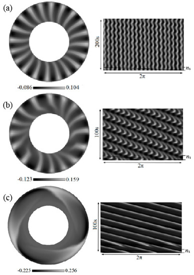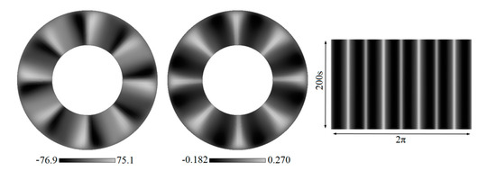 Without rotation, the surface patterns are shown as spokes. Since the Schmidt number, which is defined as the ratio of momentum diffusivity and mass diffusivity, is much larger than the Prandtl number, compared with the concentration oscillatory, the temperature fluctuation is very small and always consists with the concentration fluctuation, thus, in the following discussions about the surface patterns, only the oscillation patterns of concentration and azimuthal velocity are shown. As seen in Figure 8, the 3D oscillatory concentration and velocity are shown as spoke patterns with wave number of 7. From the spatiotemporal diagram (STD), 7 vertical lines are displayed, which indicates that the flow is steady in time but fluctuates in space. This pattern corresponds to a series of circulating cells lined up side by side in the azimuthal direction.