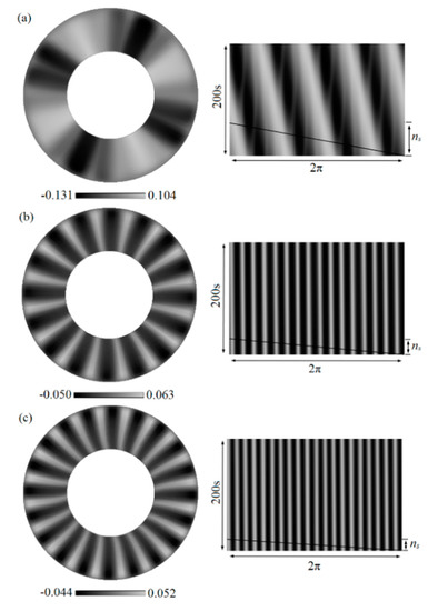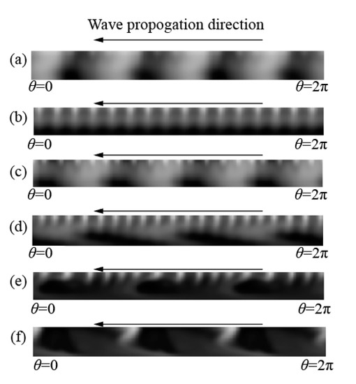 In order to show the characteristics of the unstable flow inside the crucible, the circumferential views of concentration fluctuations are plotted in Figure 13. It is shown that as the crystal rotates, the oscillation waves always propagate in the same direction with that of crystal. However, the penetration depth of the surface oscillation is depending on the competition of the thermal-solutal capillary flow and the rotation driven flow. For the given value of ReT, when the rotation rate is relatively small, the oscillations almost occupy the whole crucible, from the surface to the bottom, the oscillation pattern is almost the same, as shown in Figure 13a,b. When the value of Res is increased to 935, in the upper side of the crucible, the flow is co-dominated by the rotation and thermal-solutal capillary convections, the corresponding surface pattern is similar as that shown in Figure 11c. In the lower part of the crucible, the vertical lines disappear and the flow is almost dominated by the rotation driven flow. For the further increase of Res, the rotation domination area moves to the lower part, in the crucible, two groups of waves are clearly observed, as shown in Figure 11d,e. When the value of Res is increased to 3506, the rotation wave number is decreased to 3 and the dominant the whole flow field, as shown in Figure 11f.
