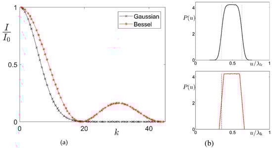 (a) Envelopes of the diffraction peaks’ intensities for the Fibonacci chain (one-dimensional quasicrystal) with phonons, I, calculated vs. intensities for perfect Fibonacci chain without phonons, I0. This is obtained by two different shapes of atomic distributions around ideal positions: Gaussian (black crosses) and Bessel function (red stars). Generally, the set of peaks is infinitely dense and its arrangement is aperiodic. For clarity, only peaks with limited indices and intensities are shown. Intensities are calculated within the statistical method as the squares of the Fourier transform of the corresponding distribution function P(u). (b) The corresponding probability distributions AUC are given by Gaussian (black) and harmonic (red) distributions. For ideal positions (no phonons), the uniform probability distribution P(u) is observed (marked with dashed lines).