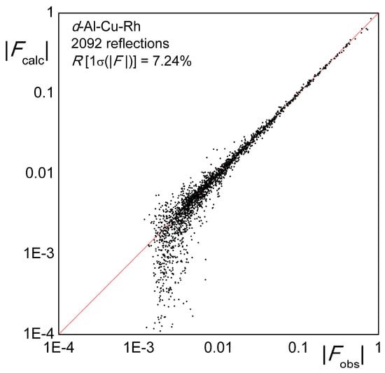 The log-log plot of calculated vs. observed diffraction amplitudes (|Fcalc|/|Fobs|) is presented in Figure 2 for 2092 peaks with dynamical range of 3 orders of magnitude. Characteristic bias is present in the low-intensities regime, which is typical behavior that is known for quasicrystals and complex metallic alloys. To our knowledge, there are at least two possible reasons for this phenomenon, which are namely (i) incorrect phasonic correction function and/or (ii) multiple scattering effect occurring in the diffraction experiment. Discussion on the influence of possible scenario (i) is explained in detail in references [,,]. The standard exponential phasonic D–W factor with vector in the exponent (see formula (3)) appears to artificially lower the intensities of reflections with large- component, which are small by definition for quasicrystals. The intensities of weak reflections become biased and even more decreased. The influence of multiple scattering in quasicrystals was recently numerically investigated [], but there is still a lack of experimental evidence. After multiple scatters, the reflected X-ray beam is weakened and causes decrease of measured intensities []. Contrary to exponential phasonic D–W, this effect affects all reflections, but there is a majority of weak ones in quasicrystals, which may be the reason of an appearance of the bias in the low-reflection regime only. The two possible scenarios are also of further research interest to authors of the present paper. In Table S1 in Supplementary Materials, all calculated and measured diffraction intensities together with extinction parameters are listed compared to 6 components of a scattering vector.