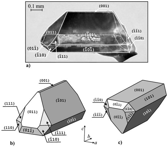 A view of struvite habit and morphology; (a) struvite grown in gel medium and (b) its schematic representation with faces indexed in accordance with the coordinate system assumed in this article; (c) faces indexed after transformation using the matrix given by Equation (2). Both polarities (b) and (c) are equivalent.