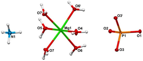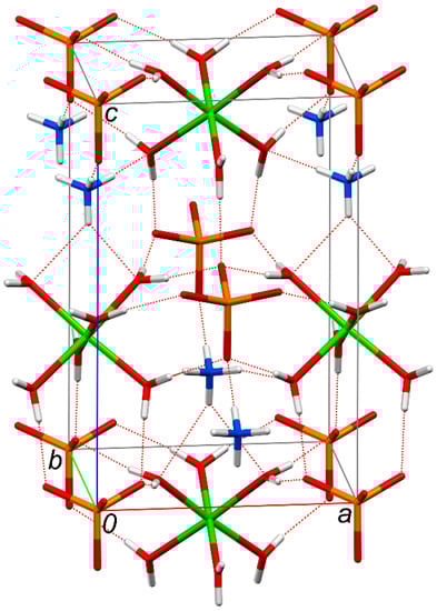 The crystal structure contains PO4− anions, hexaaqua Mg(H2O)62+ cations and NH4+ cations connected within an extended three-dimensional hydrogen-bonded network of O-H···O and N-H···O (Figure 4). Geometric parameters including hydrogen-bonding have been previously described in [33]; here they are presented with higher accuracy and summarized in Table 2 and Table 3.