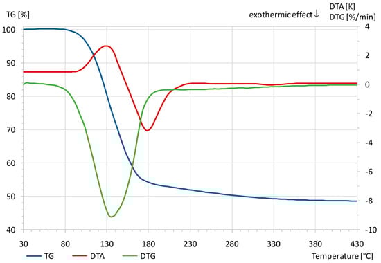 Thermal decomposition of struvite is well known in literature (e.g., Refs. [37,38,39,40]). Although the shape of our TG curve is similar to that described in Refs. [37,38,39,40], the thermal stability and peaks on the DTA curve of struvite are significantly different from literature data. From our research, we can clearly see the endothermic peak and the appearance of a new exothermic effect. This exothermic peak has not been described in any previous studies on struvite. These differences indicate the desirability of our study. Thermal decomposition of struvite in air atmosphere is a multistage process. The stages of thermolysis overlap. Struvite is stable up to 85 °C. At first, struvite releases six molecules of water and an ammonium ion. On DTA curve there is an endothermic peak at 130 °C. Above 375 °C, MgHPO4 is obtained as the final product of thermolysis (it is confirmed by XRD analysis of the sinter made by heating struvite to the temperature defined from the TG curve). This process connects with the exothermic effect on the DTA curve at 180 °C. Mass loss calculated is 50.98% and determined from the thermogravimetric curve is 51.00%, which confirms the formation of MgHPO4 at the end of the thermal decomposition process. Figure 5 presents the TG-DTA-DTG curves of struvite. Pyrolysis of struvite at flowing air atmosphere with 40 mL∙min−1 provides new information on its thermal decomposition.