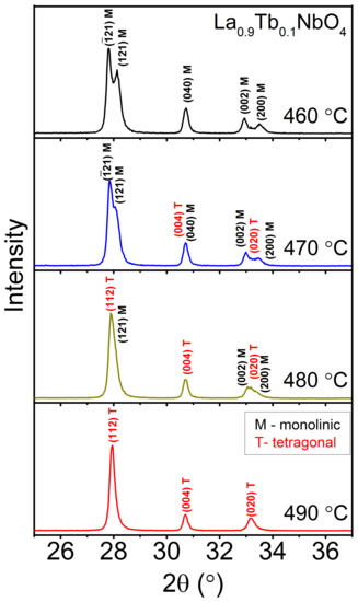 - Stubičan, V.S. High-Temperature Transitions in Rare Earth Niobates and TantaIates. J. Am. Ceram. Soc. 1964, 47, 55–58. [Google Scholar] [CrossRef]