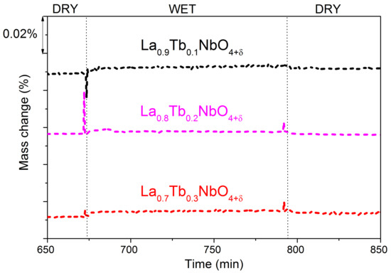 - Mielewczyk-Gryń, A. Water uptake analysis of the acceptor-doped lanthanum orthoniobates. J. Therm. Anal. Calorim. 2019. submitted. [Google Scholar]