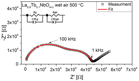 - Dzierzgowski, K.; Wachowski, S.; Gojtowska, W.; Lewandowska, I.; Jasiński, P.; Gazda, M.; Mielewczyk-Gryń, A. Praseodymium substituted lanthanum orthoniobate: Electrical and structural properties. Ceram. Int. 2018, 44, 8210–8215. [Google Scholar] [CrossRef]