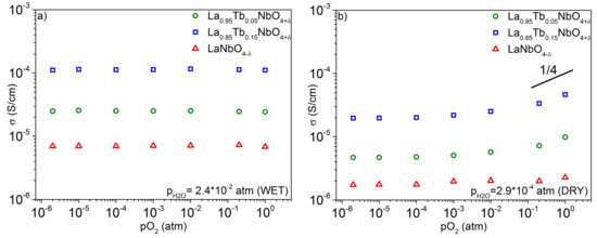 - Wachowski, S.; Mielewczyk-Gryn, A.; Zagorski, K.; Li, C.; Jasinski, P.; Skinner, S.J.; Haugsrud, R.; Gazda, M. Influence of Sb-substitution on ionic transport in lanthanum orthoniobates. J. Mater. Chem. A 2016, 4, 11696–11707. [Google Scholar] [CrossRef]