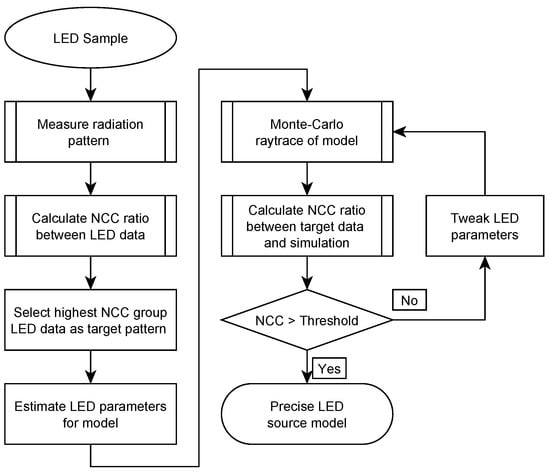 Figure 2. Firstly, the angular intensity distributions of LED samples are measured to form the target pattern in the simulation. Secondly, an initial LED model is constructed using the physical parameters of through-hole LED samples. The angular intensity distributions of the LED model are then generated by Monte Carlo ray tracing and compared with the target pattern. The parameters of the LED model are tweaked repeatedly until the normalized correlation coefficient (NCC) between the measured and simulated data exceeds the preset threshold, 95%.