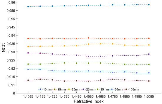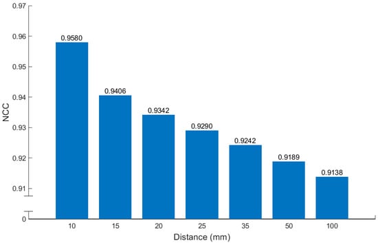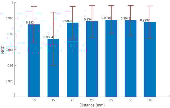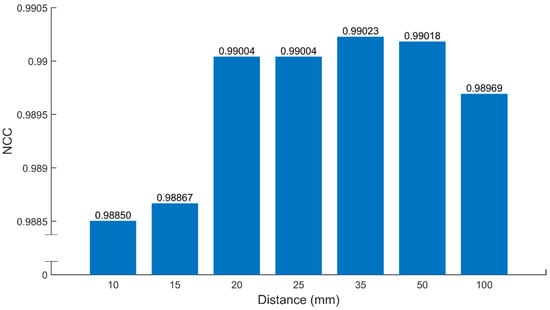 Figure 20 that the curve for the 10 mm distance has a nice peak around 3.7–3.9 mm, while the curves for other distances are on the plateau at the same 3.7–3.9 mm region. Combining with the average NCCs shown in