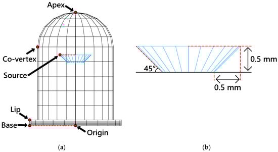 Table 1 is the distance between the point of interest and the base. As for the cup immersed in the dome package, the depth of it is fixed at 0.5 mm and the angle at the side is also fixed at 45° as shown in