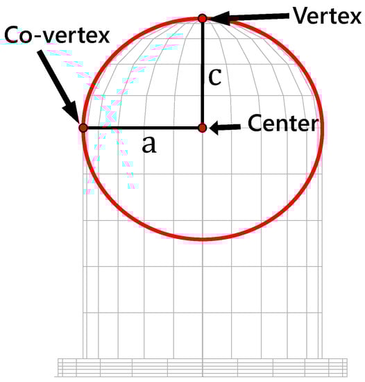 Figure 10. By defining three points in two-dimensional space—one as the center of the ellipse, the other two as the vortexes—then rotating the arc around the vertical axis, we got the half spheroid, which we henceforth refer to as the dome of the through-hole LED. The full equation for a spheroid is shown in Equation (2). For example, if a = c then the spheroid reduces to a common sphere.