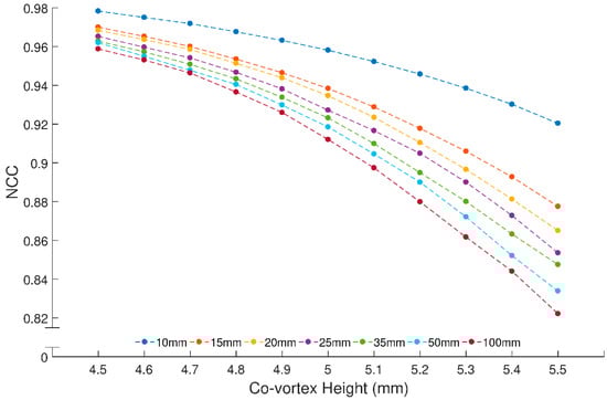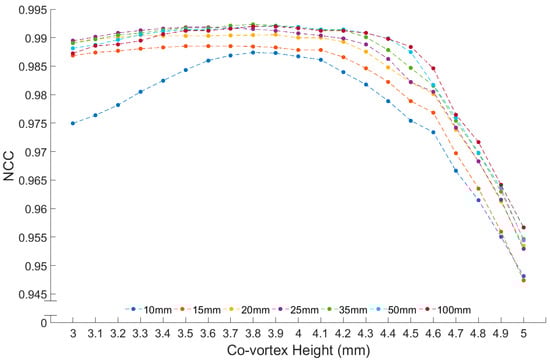 Figure 11 shows the NCC values calculated at all the distances that we have measured our representative angular intensity distribution, which are 10, 15, 20, 25, 35, 50, and 100 mm. The graph shows that there is a trend where, as the co-vortex lowers, the NCC values steadily increases, but we still see no signs of a peak or saturation. Also, the relationship between different measuring distances stay somewhat the same, which is a good sign that we have a stable model.