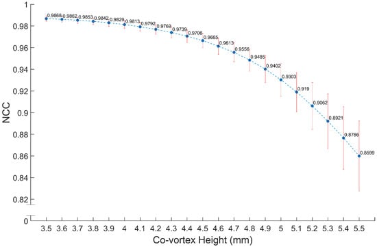 To see the change in NCC by just tweaking the eccentricity of the dome, we calculated the NCC average and standard deviation across seven measuring distances for each co-vertex height. We found that the highest NCC, 96.65%, is still just barely above the goal of 95%, but with no sign of a peak or saturation. Also, the standard deviation between distances decreases as we come lower co-vortex height, meaning that we are closer to the real value. So, a second trial was done for the co-vortex height of 3.5–4.4 mm with 0.1 mm increments. The results are shown in