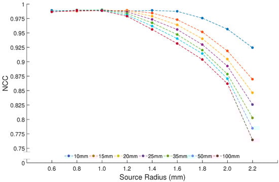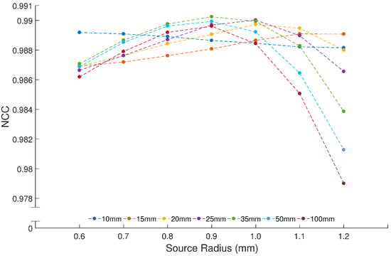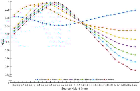 Values used in the regression process for the source height are 2.5–5.5 mm, with 0.1 mm increments, where the source radius is kept at 1.0 mm. Resulting NCC plots for all measuring distances are shown in